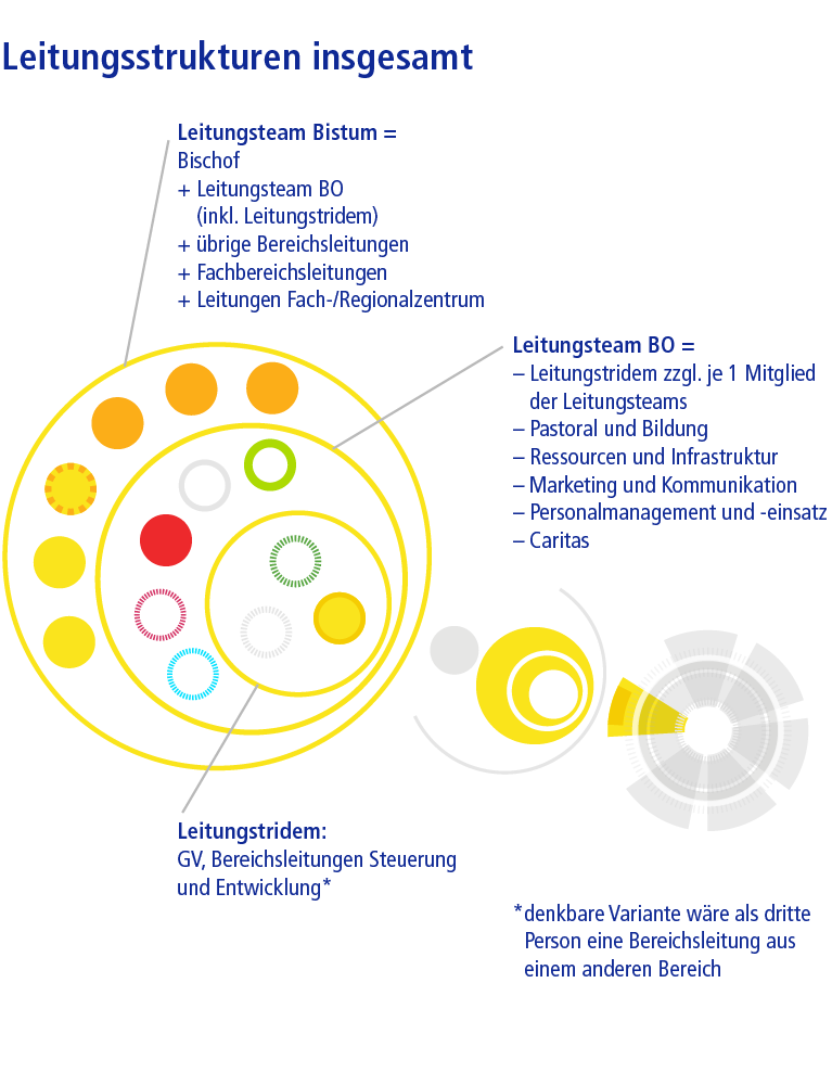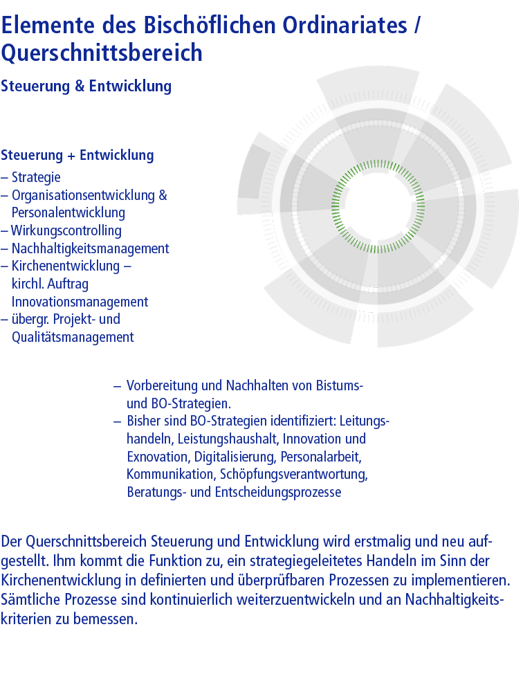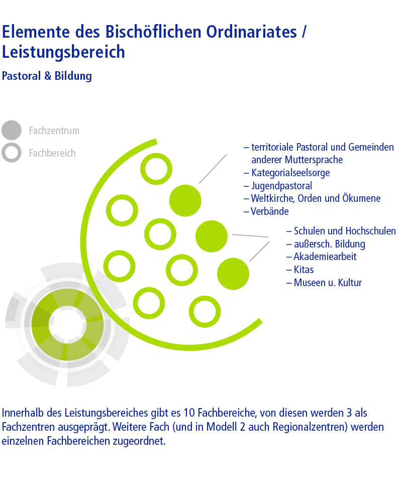 Für das Bischöfliche Ordinariat wird eine Neuaufstellung mit zwei Leistungsbereichen ‚Pastoral und Bildung‘ und ‚Ressourcen und Infrastruktur‘ vorgeschlagen. Drei Querschnittsbereiche (‚Steuerung und Entwicklung‘, Personalmanagement und –einsatz; ‚Marketing und Kommunikation‘) sollen für ein verzahntes Arbeiten in der Organisation sorgen. Eine veränderte Leitungsstruktur soll die Teamorientierung zusätzlich stärken.